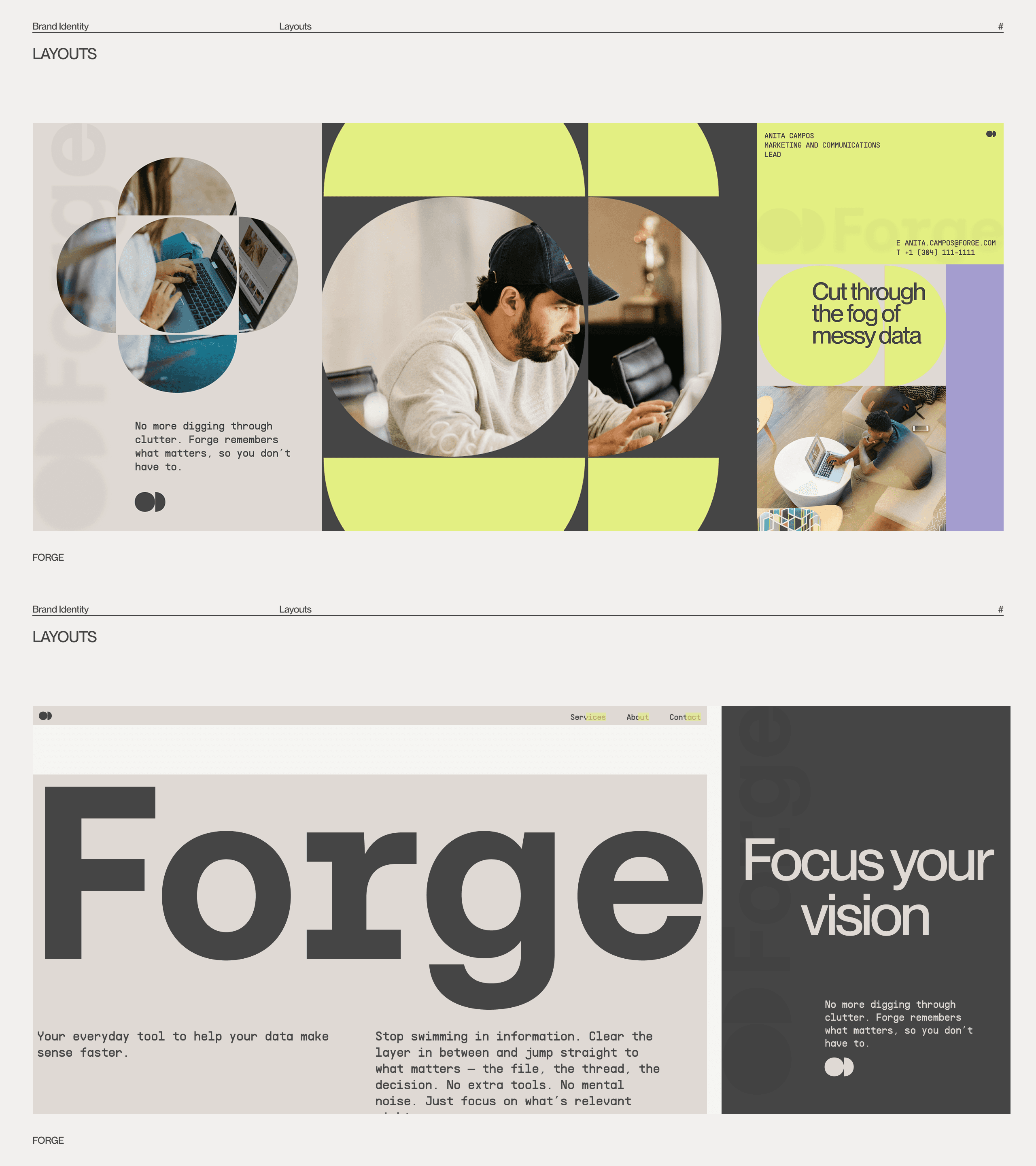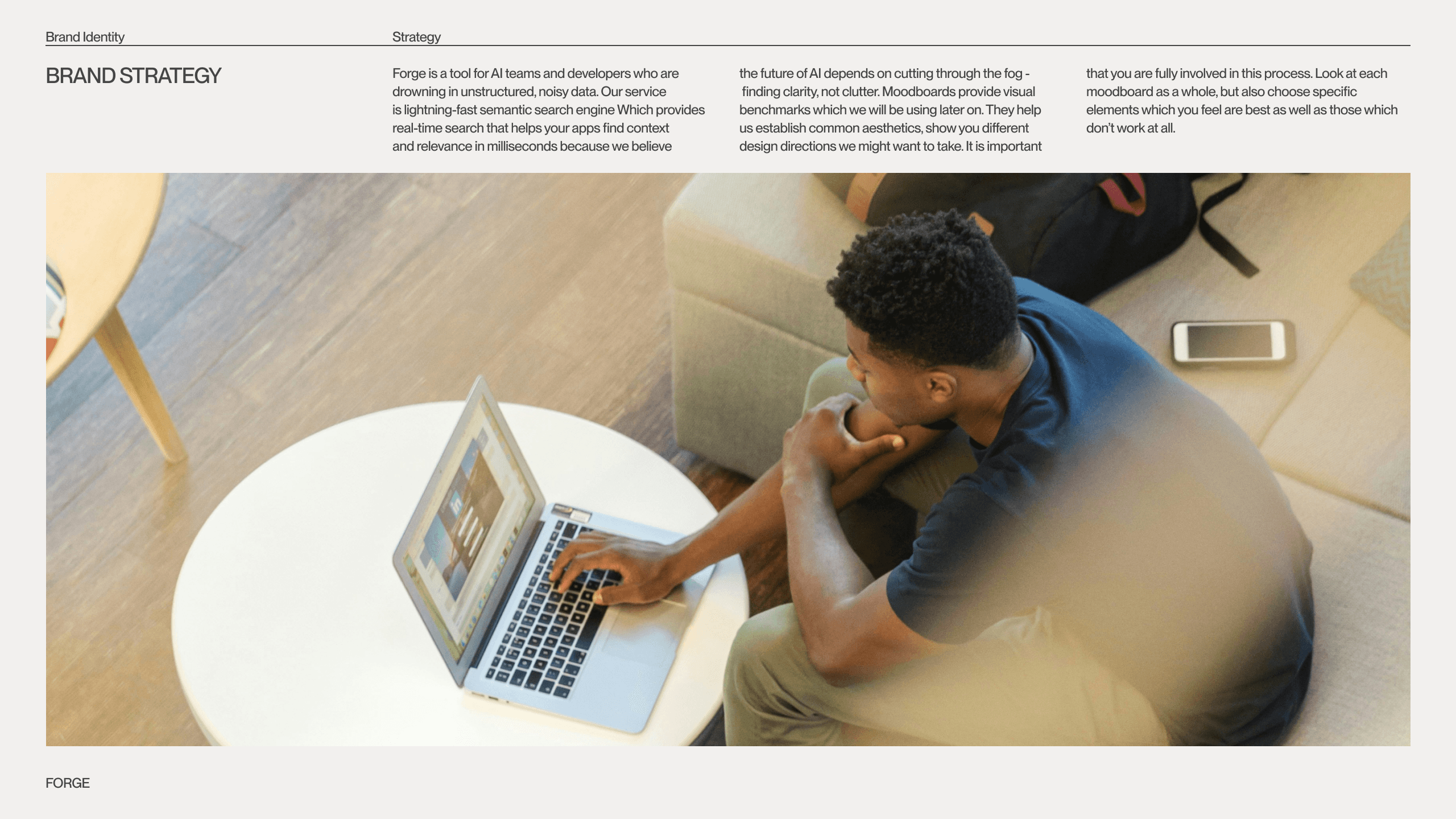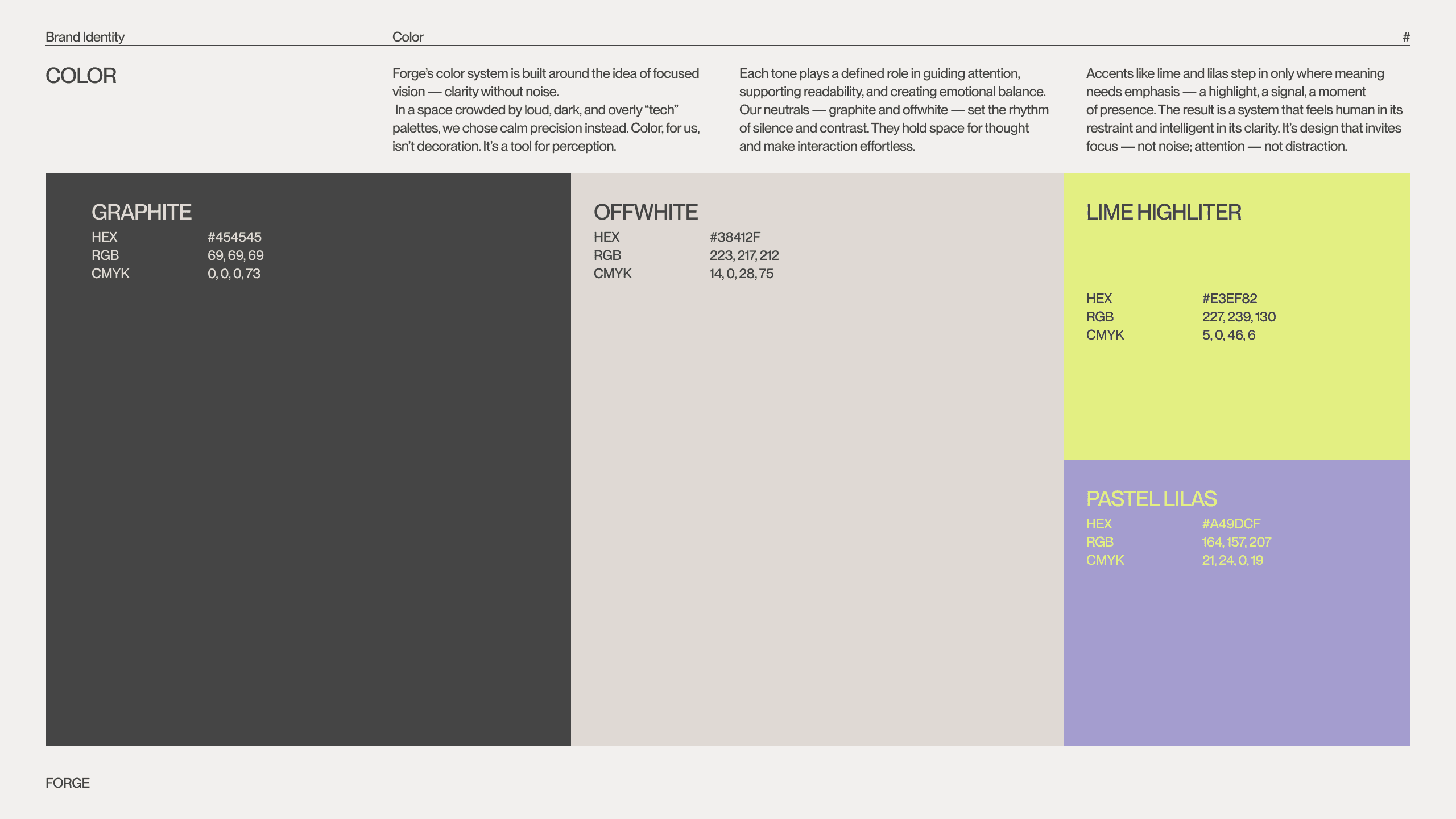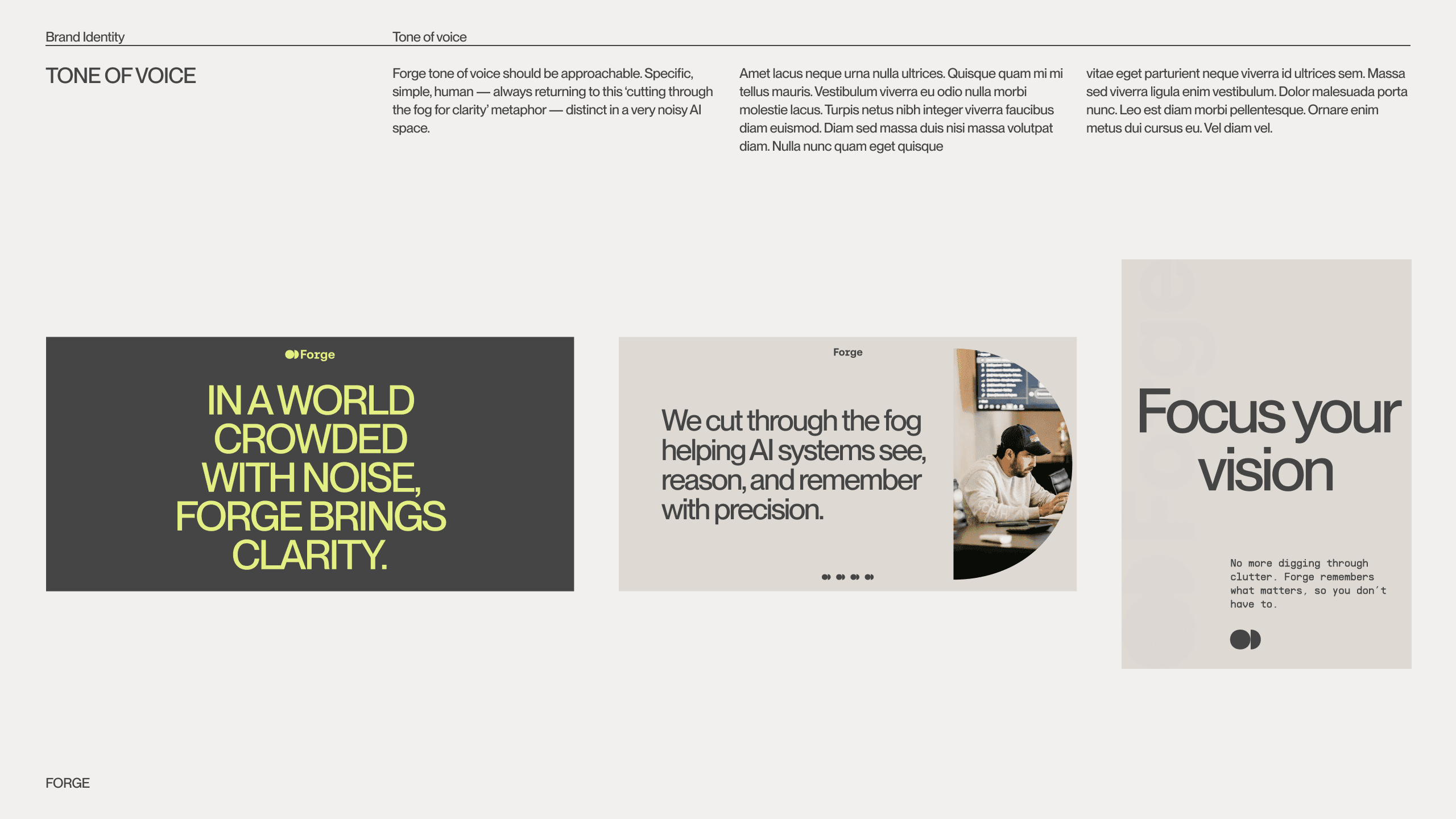 Forge empowers AI teams and developers overwhelmed by unstructured, noisy data. It provides real-time search technology that enables applications to find context and relevance in milliseconds. Designed for those building the future of intelligent systems, Forge cuts through the fog of information to bring clarity, precision, and focus — because the future of AI depends on understanding, not overload. For the conceptual project Forge, I guided the full brand development journey — from defining the strategy and writing the brief, to creative direction and client collaboration. I designed moodboards, explored conceptual directions, and built a complete, consistent brand identity. This project was created on TDA Brand #5 worshops by Tonik.